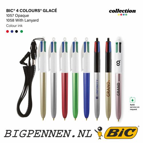 BIC® 4 Colours Glace balpen bedrukt met uw logo, deze BIC® pen is een van goede kwaliteit en een goed design met veel schrijfplezier voor jong en oud.