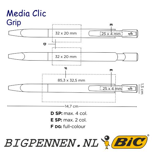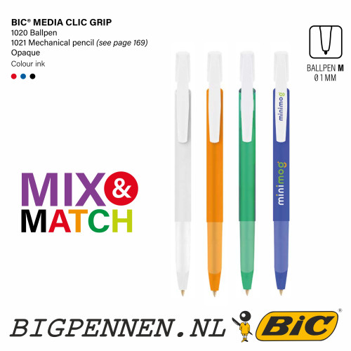 BIC® media clic grip balpen bedrukt met uw logo, deze BIC® pen is een lekkere pen met een heerlijke grip, goedkoop maar wel van een goede kwaliteit met veel schrijfplezier voor jong en oud. De BIC® media clic grip balpen heeft bij de opaque kleuren een onbreekbare clip en een vette vulling die op bijna alles schrijft, kleine afname mogelijk.